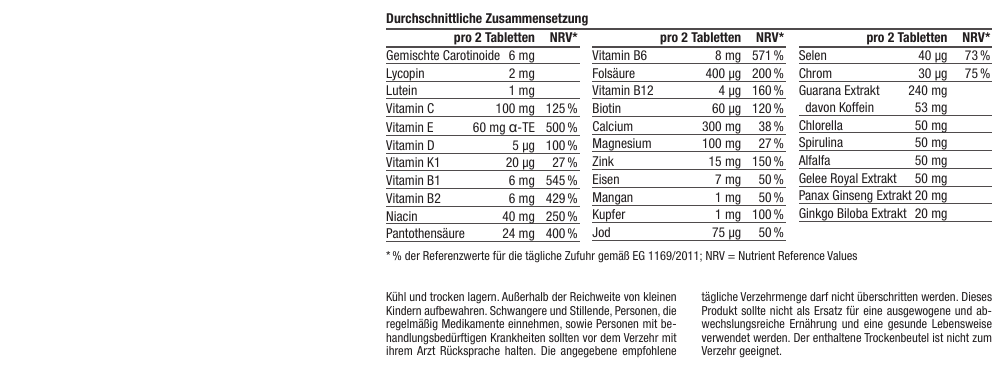 Calciumcarbonat, Füllstoff mikrokristalline Cellulose, Guarana Extrakt, Magnesiumoxid, L-Ascorbinsäure, D-alpha Tocopherylsäuresuccinat, natürliche gemischte Carotinoide, Füllstoff Hydroxypropylcellulose, Chlorella pyrenoidosa-Algenpulver, Spirulina-Algenpulver, Alfalfa Pulver, Gelee Royal Extrakt, Zinkcitrat, Tomatenextrakt mit Lycopin, Nicotinamid, Trennmittel Magnesiumsalze der Speisefettsäuren, Calcium-D-pantothenat, Eisenfumarat, Panax Ginseng Extrakt, Ginkgo Biloba Blattextrakt, Überzugsmittel Hydroxypropylmethylcellulose, Tagetes erecta Extrakt mit Lutein, Pyridoxinhydrochlorid, Thiaminhydrochlorid, L-Selenomethionin, Kupfergluconat, Riboflavin, Mangancitrat, Chrompicolinat, Pteroylmonoglutaminsäure, Kaliumiodid, Biotin, Cholecalciferol, Phytomenadion, Cyanocobalamin.